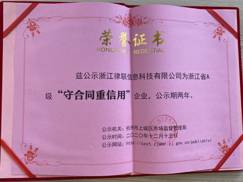2020年12月,浙江律聯(lián)信息科技有限公司憑借多年的誠信經(jīng)營和規(guī)范管理,通過杭州市市場(chǎng)監(jiān)督管理局的嚴(yán)格評(píng)審,榮獲浙江省A級(jí)“守合同重信用企業(yè)”的稱號(hào)。